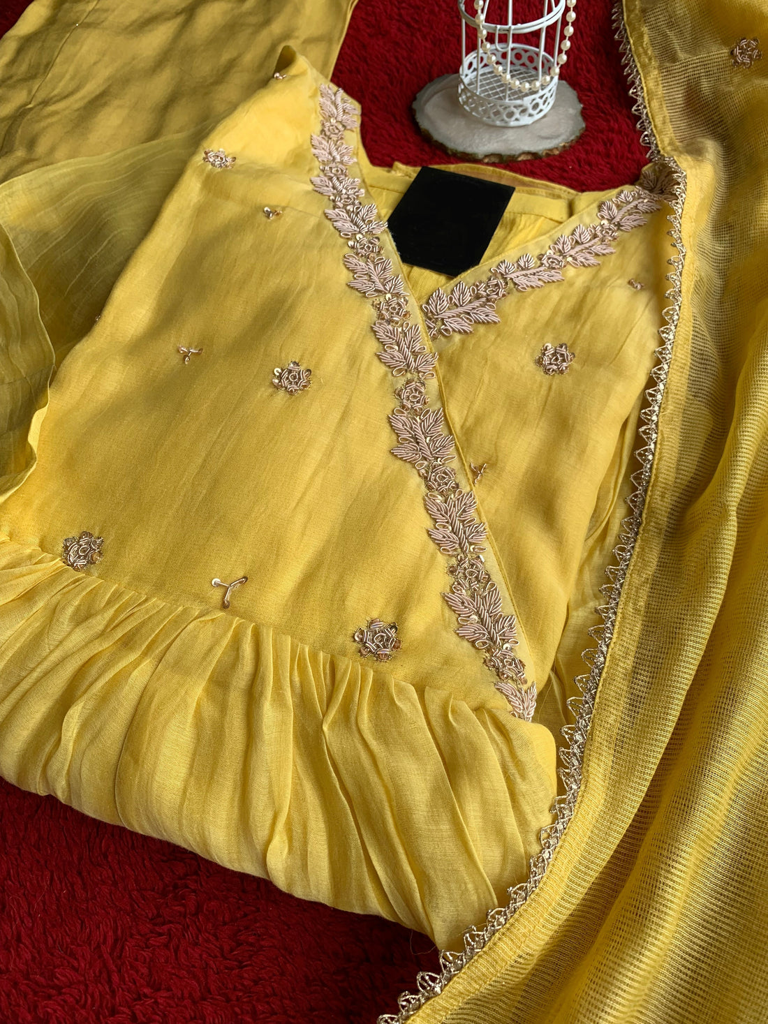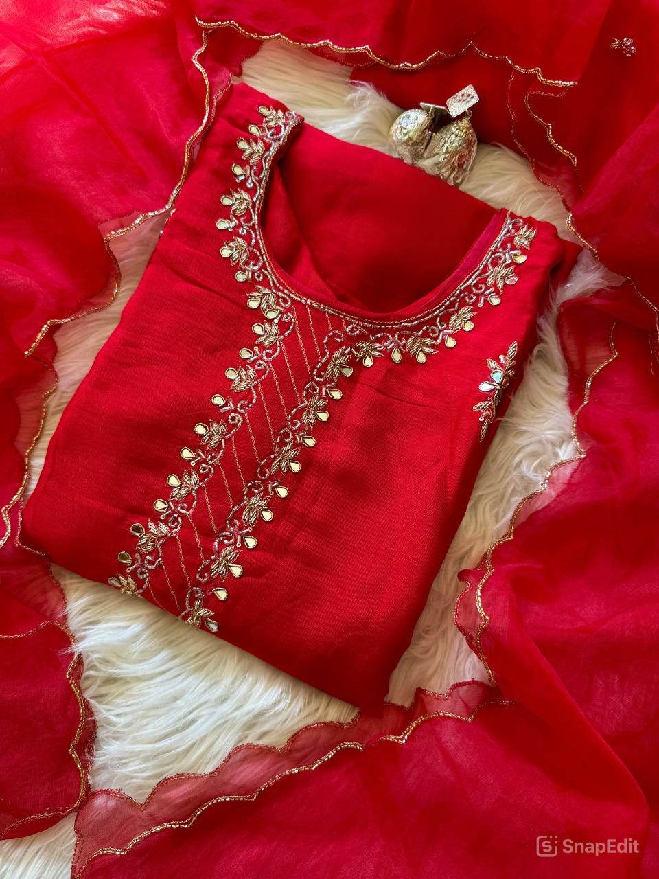 Fabric – Dola silkKurta Length – 46 InchBottom Length– 38 InchSleeve – 3 4Dupatta – OrganzaColour– RedMaintenance – Dry Cleaning...