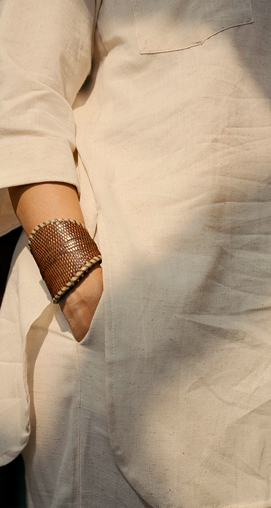 The Pathani-kurta inspired half-open shirt has a collar and two pockets. It has 3/4th sleeves that can be styled as is, rolled up or cinched with a tab so you can make the set your own.